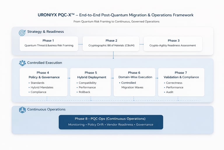 PQC-X™ is Uroniyx’s end-to-end post-quantum migration and operations framework, designed to help organizations move safely from quantum risk awareness to sustained post-quantum resilience.